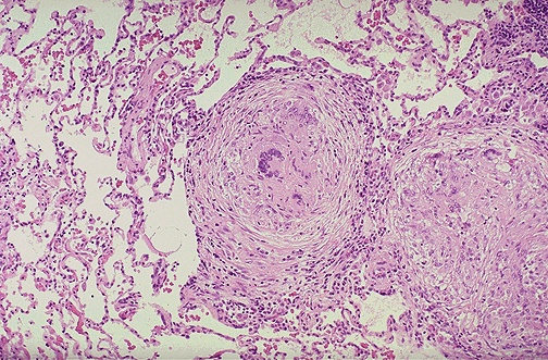 | Well-defined granulomas are seen here. They have rounded outlines. The one toward the center of the photograph contains several Langhans giant cells. Granulomas are composed of transformed macrophages called epithelioid cells along with lymphocytes, occasional PMN's, plasma cells, and fibroblasts. The localized, small appearance of these granulomas suggests that the immune response is fairly good. |