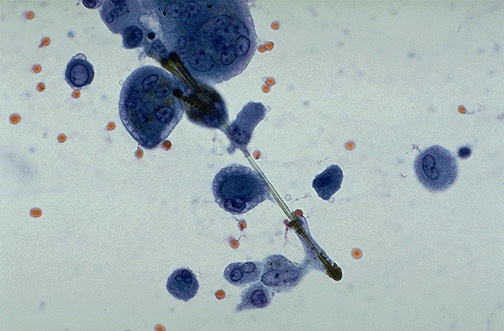 | This is the causative agent for asbestosis. This long, thin object is an asbestos fiber. Some houses, business locations, and ships still contain building products with asbestos, particularly insulation materials, so care must be taken when doing remodelling or reconstruction. |