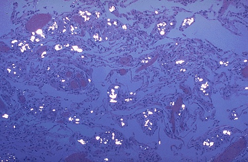 | Bright white collections of polarizable crystals are seen here, but are diffuse and centered around vascular spaces. This is the lung of a patient with a long history of intravenous drug use. Only about 1% of such persons get a significant degree of pulmonary fibrosis. The crystals represent talc that is used to to dilute the injected drug. |