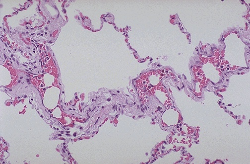 | The rounded holes that appear in the vascular spaces here in the lung are fat emboli. Fat embolization syndrome occurs most often following trauma with fracture of long bones that releases fat globules into the circulation which are trapped in pulmonary capillaries. Cumulatively, they have the same effect as a large saddle pulmonary embolus. |