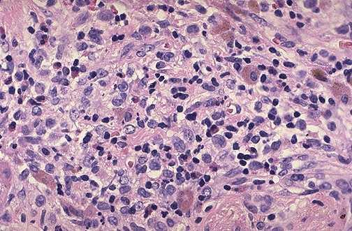 | At high magnification, the eosinophilic granuloma is composed of a mixture of inflammatory cells, with round to oval macrophages (which contain characteristic rod-shaped HX bodies by electron microscopy), lymphocytes, plasma cells, and even some eosinophils. |