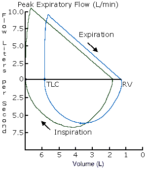 | Above is a flow-volume loop diagrammatic representation of pulmonary function with restrictive lung disease in blue, compared to normal in green. |