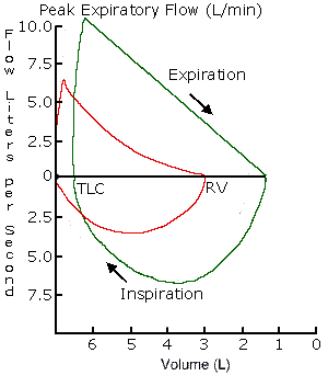 | Above is a flow-volume loop diagrammatic representation of pulmonary function with obstructive lung disease in red, compared to normal in green. |