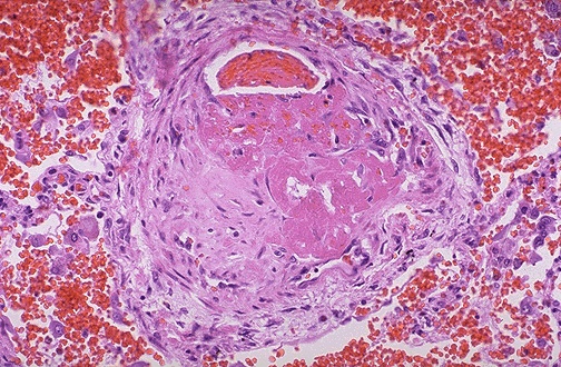 | Here is a small peripheral pulmonary artery thromboembolus. Such a small pulmonary embolus (PE) such as this one would probably not be noticed or cause problems unless there were many of them showered into the pulmonary circulation at once or over a period of time. This could lead to pulmonary hypertension. |