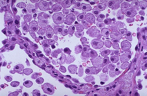 | This is the microscopic appearance of an endogenous lipid pneumonia in which numerous foamy lipid laden macrophages are present in alveolar spaces. The term endogenous refers to the origin of the lipid material from breakdown of lung and blood, usually distal to the site of an obstructive process (such as a neoplasm, an inhaled foreign body, or bronchiectasis). Blood monocytes become macrophages that collect to ingest the lipid material. |