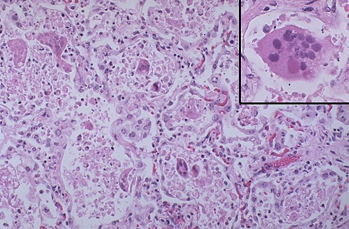 | This is respiratory syntytial virus (RSV) in a child. Note the giant cells which are part of the viral cytopathic effect. The inset demonstrates a typical giant cell with a round, pink intracytoplasmic inclusion. RSV accounts for many cases of pneumonia in children under 2 years, and can be a cause for death in infants 1 to 6 months of age or older. |