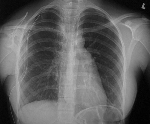 | The radiograph above demonstrates a pneumothorax on the right, with the mediastinum and heart shifted to the left. A pneumothorax results from rupture of the lung or a penetrating injury to the chest wall that allows air to enter the pleural cavity. A chest tube has been inserted here to help re-expand the lung. The faint border of the displaced visceral pleura surface is marked in the radiograph below. |