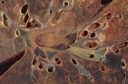 ![]() | Aspergillus species have a tendency to invade vessels, even large pulmonary arterial branches as seen here, with a thrombus formed of fungal hyphae as well as blood clot filling the lumen. This can result in dissemination to other organs, as well as pulmonary infarction. |