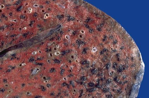 | Here is centrilobular emphysema of the upper lung fields. The central lobular loss of tissue with intense black anthracotic pigmentation is apparent. Unlike the risk for lung cancer, which diminishes when a smoker stops smoking, the lung tissue loss with emphysema is permanent. |