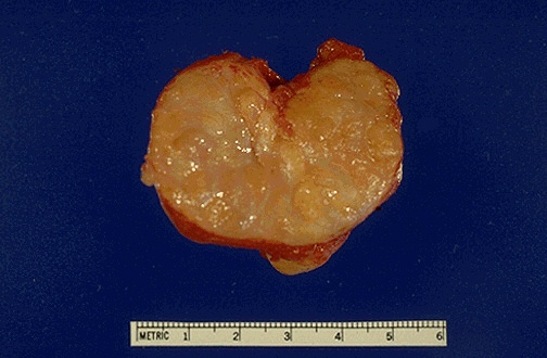 | A normal prostate gland is about 3 to 4 cm in diameter. This prostate is enlarged due to prostatic hyperplasia, which appears nodular. Thus, this condition is termed either BPH (benign prostatic hyperplasia), also termed nodular prostatic hyperplasia. |