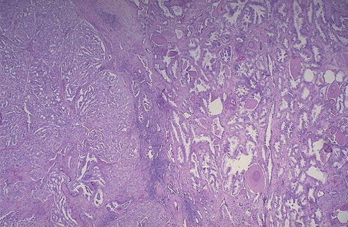 | At the right are normal prostatic glands containing scattered corpora amylacea. At the left is prostatic adenocarcinoma. Note how the glands of the carcinoma are small and crowded. Prostatic adenocarcinomas are given a histologic grade (Gleason's grading system is used most often, and includes a score of 1 to 5 for the most prominent component added to a score of 1 to 5 for the next most common pattern). For example, this adenocarcinoma could be given a Gleason grade of 3/3. |