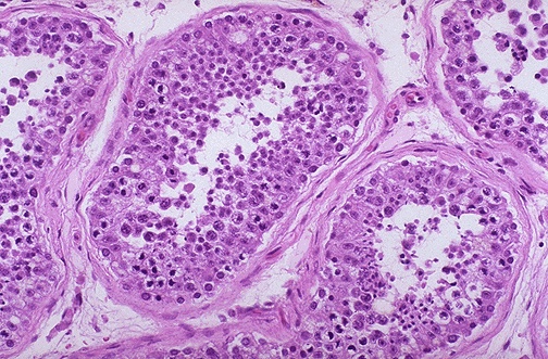 | This is the microscopic appearance of the normal testis. The seminiferous tubules have numerous germ cells. Sertoli cells, with cytoplasm that extends between the germ cells, are inconspicuous. Small dark oblong spermatozoa are seen toward the center of the tubules. |