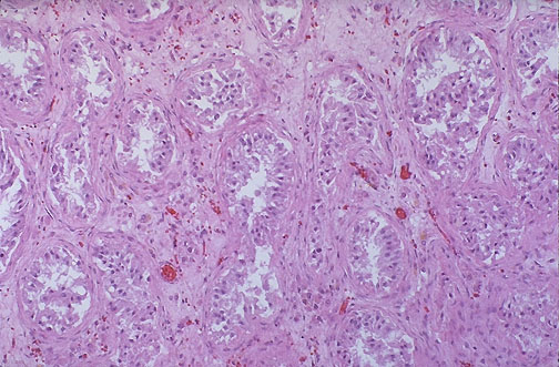 | Atrophic testis is demonstrated here. Note the marked loss of germ cells with remaining tall pink Sertoli cells, peritubular fibrosis, and interstitial fibrosis. If generalized, this is a cause for infertility. About half the time when infertility occurs in couples wanting children, the cause is a problem in the male genital system. |