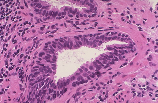 | The prostatic intraepithelial neoplasia (PIN) shown here can be low or high grade (as seen here). An adenocarcinoma accompanies high grade PIN about half the time. Note the stromal lymphocytic infiltrates, consistent with chronic prostatitis, an unrelated lesion. |