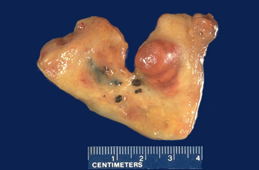 | This section through the prostate reveals a single prominent nodule that proved to be an adenocarcinoma. Such nodules may be palpable via digital rectal examination or may appear on ultrasound. Some small dark glandular concretions are also seen here. |
