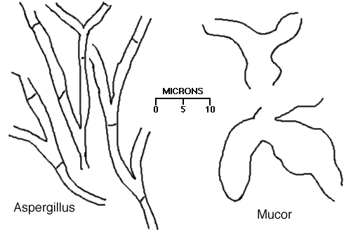 | | ![]() Aspergillus - septate hyphae with branching at an acute angle | Mucor - broad, short non-septate hyphae | ![]() Round to [American] football-shaped with narrow-based budding, often has a large, thick surrounding capsule