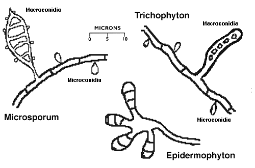 | | ![]() Blastomyces - Rounded yeasts with broad-based budding | Paracoccidioides - large yeast with small peripheral buds ("captain's wheel') | ![]() These dermatophytes produce superficial skin infections such as Tinea corporis ("ringworm") and Tinea pedis ("athlete's foot"). The thin hyphae have various fruiting structures