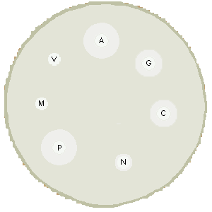 Antimicrobial sensitivity testing of the organism can be performed. The Kirby-Bauer plate shown below illustrates the diffusion disk method in which antibiotic-impregnated disks are placed on a culture plate with the organism, and the zone of inhibition of growth is measured, compared to controls. In general, less than 2 mm of inhibition defines resistance, while a large zone of inhibition suggests sensitivity. Smaller zones imply intermediate sensitivity. In the example below, the organism is sensitive to Amikacin and Penicillin, with intermediate sensitivity to Gentamicin and Cefotaxime, with resistance to Methicillin, Vancomycin, and Nafcillin.