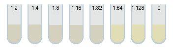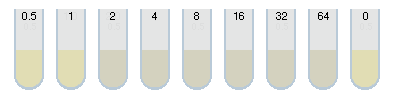 The series of test tubes shown below demonstrate the minimum inhibitory concentration (MIC) method. 1 ml of broth containing the organism is added to each tube; the tubes contain serial dilutions of an antibiotic, ranging from 0.5 microgram/mL to 64 microgram/mL. A control tube contains no antibiotic. The MIC is the tube with the lowest level (highest dilution) of antibiotic in which no growth occurs.