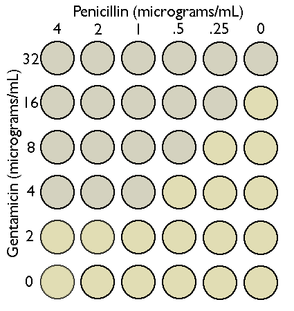 The usefulness of antibiotic combinations showing synergy of bactericidal activity can be demostrated similarly. In the example below, the wells inoculated with an organism contain increasing concentrations of two antimicrobial agents. While a concentration of 32 micrograms/mL is required to inhibit growth by gentamicin alone, a combination of 4 micrograms/mL of gentamicin with 1 microgram/mL of penicillin will inhibit growth.