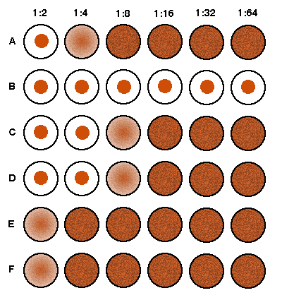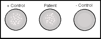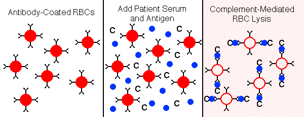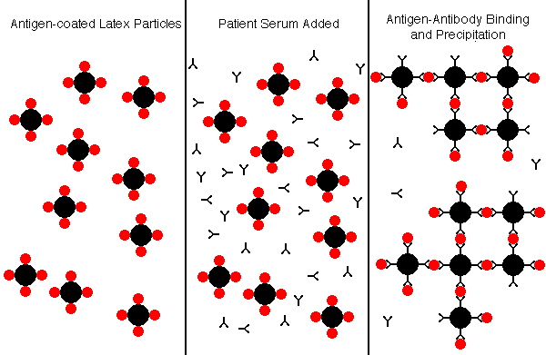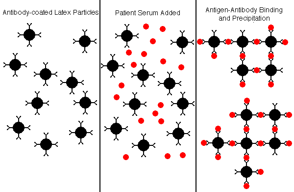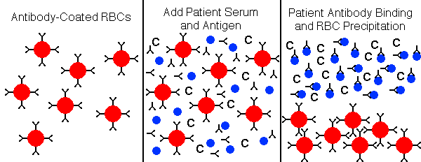 Latex AgglutinationThe latex agglutination (LA) assay is a simple and inexpensive method for determining if antibodies to a variety of viral agents are present. In the example below, the latex particles are coated with antigen, and the presence of specific antibody in the patient serum will result in agglutination of the particles. ![]() Alternatively, in the example below, the latex particles are coated with antibody, and the presence of specific antigen in the patient serum will result in agglutination of the particles. ![]() A rapid latex particle agglutination test is often performed using reagents and samples on a card, and the agglutination reaction is read from the card after a short incubation time of a minute or two. ![]() Complement FixationComplement fixation (CF) tests have largely been replaced by enzyme immunoassays which have greater sensitivity. In the example shown below, patient serum, which normally contains complement components, is added along with antigen (such as viral antigen) to the tube or well. If no patient antibody is present to the antigen, then the antigen will attach to the RBCs, and the antigen-antibody complex will fix complement that lyses the RBCs, leading to hemolysis. ![]() In the example below, the patient serum contains specific antibody to the antigen, forming soluble antigen-antibody complexes, while the RBCs precipitate to the bottom of the tube or well. ![]() The patient serum to be tested is often serially diluted, in order to provide an estimate of the strength of the antibody titer. In the example below, the top row represents the "acute" titer of patient antibody (the initial antibody response, or persistent antibody from past exposure to the antigen). The bottom row represents the "convalescent" titer from a sample drawn 2 weeks later, when the secondary antibody response occurred. The four-fold increase in titer from acute to convalescent suggests that a recent encounter with the antigen (such as an acute viral infection) occurred. It is now more common to measure IgM and IgG specific antibody on a single sample to determine if an acute response has occurred. ![]() Hemagglutination InhibitionHemagglutination inhibition (HI) is a technique that is based upon a surface feature of some viruses which have hemagglutinin spikes on their surfaces that can attach to receptors on RBCs and cause agglutination (clumping) of the RBCs. If there are specific antibodies to the viral hemagglutinins, then the antibody binding prevents the viruses from attaching to the RBCs, and agglutination of the RBCs is inhibited. The test is performed by adding serial dilutions of patient serum to a series of wells that contain RBCs and viral antigen. When sufficient patient antibody is present to bind to viral antigen, then agglutination is inhibited and the RBCs precipitate to the bottom of the well, forming a button. When there is no patient antibody present, then the virus will cause agglutination to form a lattice or web that keeps the RBCs in suspension and prevents them from sinking to the bottom of the well. In the example below, serial dilutions of patient sera are added to wells containing suspensions of RBCs and viral antigen, such as influenza A. Rows A and B represent acute and convalescent samples on patient 1, rows C and D patient 2, and rows E and F patient 3 respectively. How would these findings be interpreted? ![]() Patient 1 has had more than a four-fold increase in titer, suggesting an acute influenza A viral infection. Patient 2 has a low titer of antibodies that did not increase, so this suggests a past influenza A infection. There is no inhibition in the wells for patient 3, who presumably has never been infected. |