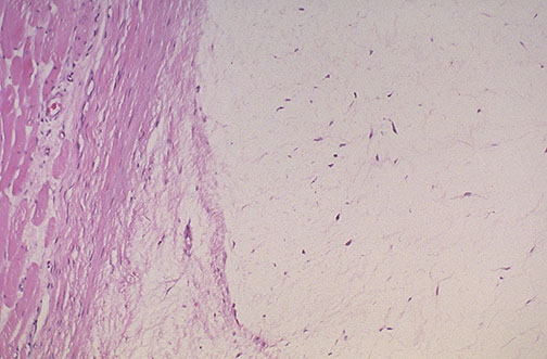 | This myxoma at the center and right is seen microscopically to be relatively acellular. Normal skeletal muscle and fascia appear at the left. The neoplasm is mostly composed of a "myxoid" material consisting of intercellular ground substances along with a few scattered spindle to stellate fibroblast-like cells. |