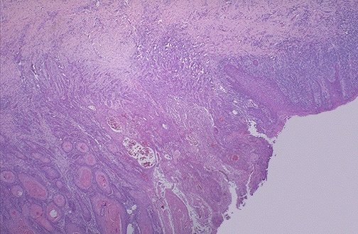 | This is the microscopic appearance of neoplasia, or uncontrolled new growth. Here, the neoplasm is infiltrating into the underlying cervical stroma. Of course, there can be carcinoma in situ in which a full-fledged neoplasm is present, but has not yet invaded. Over time, neoplasms may acquire characteristics that make them able to invade tissues, and this distinguishes them as malignant. |