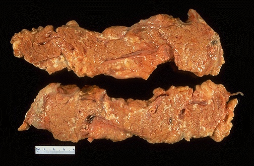 | Yellow-tan foci of fat necrosis are visible throughout the pancreas seen here which has been sectioned in half. There is some edema, but no hemorrhage in this case of mild acute pancreatitis. In addition to gallstones, causes for acute pancreatitis include viral infections, drugs, marked hypertriglyceridemia, hypercalcemia, toxins, and blunt abdominal trauma. |