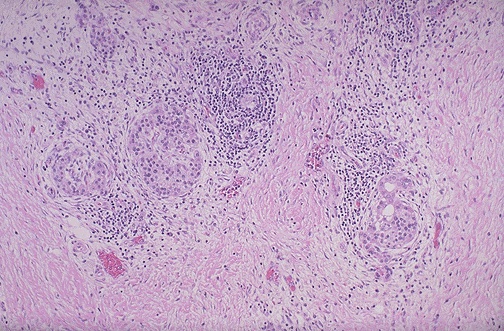 ![]() | Microscopically, this low power photomicrograph demonstrates scattered chronic inflammatory cells in a collagenous stroma, with a few remaining islets of Langerhans, in a case of chronic pancreatitis. Chronic alcoholism is a common cause for this condition, but long-standing obstruction of the pancreatic duct from gallstones or masses may produce inflammation. Some cases may be related to germ line mutations in the PRSS1 and SPINK1 genes. |