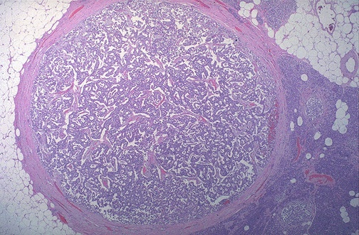| This is a small islet cell tumor of the pancreas. It is well encapsulated and is an adenoma. Both benign and malignant islet cell tumors may, in some cases, function and secrete one or more hormones, including insulin, glucagon, gastrin, somatostatin, or even ACTH. |