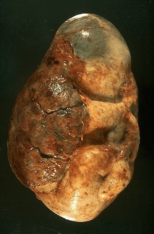 | The relationship of the placenta to the amniotic cavity and fetus is shown here in the case of a term infant whose mother died in an accident. The placental disk is at the left, with the maternal surface that would be attached to the uterus at the decidual plate. The baby is seen inside the amniotic cavity. The amniotic fluid in this cavity allows for fetal movement and protects the baby. |