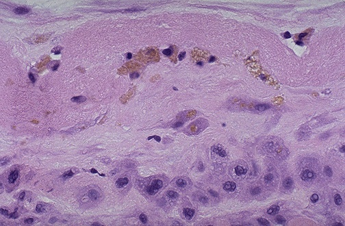 If the fetus lives in utero following the meconium spillage, then the yellow-brown pigment can be taken up into