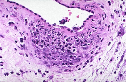 | Premature and/or prolonged rupture of fetal membranes (PROM) increases the risk for intrauterine infection, because bacteria can pass into the normally sealed amniotic cavity. This leads to acute inflammation as seen here as an acute chorioamnionitis within the fetal membranes. The fetus may become infected and suffer intrauterine fetal demise. Also, the inflammation may lead to premature labor and premature birth. |