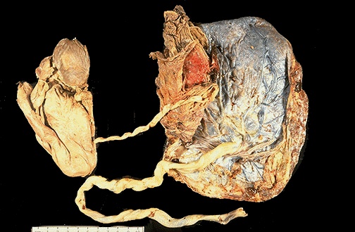 | The markedly macerated fetus at the left was delivered along with the placenta after the liveborn twin was delivered. The reason for the demise here is a "twin-twin transfusion" syndrome in which a vascular anasomosis between the two fetal circulations in a monochorionic twin placenta leads to diminished blood flow to one twin (the "donor") and increased blood flow to the other twin (the "recipient"). The donor may die for lack of blood, or the recipient may die from congestive heart failure. |