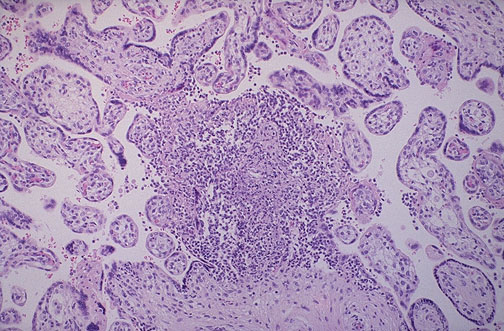 | Placental villitis is shown here with a small microabscess containing mostly neutrophils in a case of congenital infection with Listeria monocytogenes. Listeriosis is generally not life-threatening to the mother, but is potentially a cause for fetal demise. |