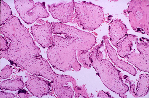 | There is marked involution of placental villi here because of prolonged fetal demise. Note the fibrosis of the villi. The villi are also quite small, even though this is a second trimester placenta. Such placental dysmaturity is a finding with prolonged demise. |