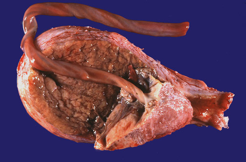 | In this gravid uterus, the placenta implanted over the cervical os. This is called placenta previa. Implantation in this low lying position leads to a less functional placenta than one implanted in the fundus, and when labor starts, placenta previa can lead to extensive hemorrhage as the dilation of the cervix disrupts the placenta. |