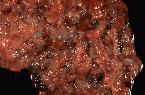 | This is a partial hydatidiform mole. Note that there are only scattered grape-like villi. Such a partial mole occurs when an ovum is fertilized by two haploid sets of paternal chromosomes. This may occur with dispermy when two sperms fertilize a single ovum, or when a diploid sperm fertilizes an ovum, or if a haploid sperm fertilizes a diploid ovum. The result is triploidy with 69 chromosomes. Since a maternal set of chromosomes is present, a fetus develops, but it is malformed, and the pregnancy rarely goes to term. Only some of the villi are grape-like. Choriocarcinoma is a rare outcome of a partial mole. |