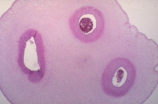 Here is a normal three vessel umbilical cord. Note that there are two arteries toward the right and a single vein at the left. Most of the parenchyma of the cord consists of a loose mesenchyme with intercellular ground substance (Wharton's jelly).