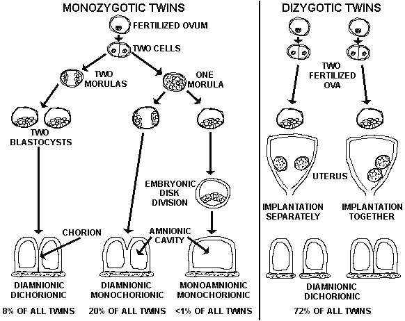 | The process of twinning is diagrammed here. Note the different possibilities. A histologic section through the dividing membranes is useful to help determine the possibilities. A dividing membrane that is "monochorionic" implies monozygous twinning. However, a "dichorionic" twin placenta could result from either dizygous or monozygous twinning (the former more likely). |