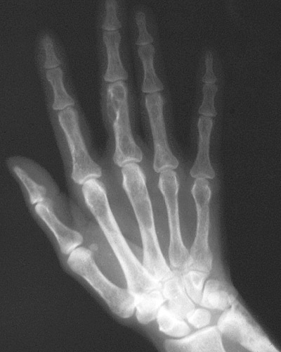 | This radiograph of the hand demonstrates osteitis fibrosa cystica with areas of rarefaction, typical of patients with primary hyperparathyroidism. As seen in the more advanced case here, cystic areas develop from the osteoclastic activity, and the marrow becomes fibrotic. Microfractures can occur in the weakened bone. |