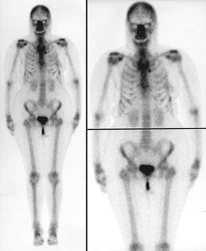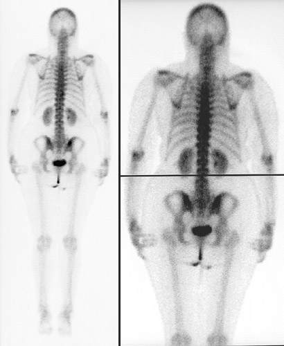 | These composite images in a posterior view above and anteriorly below represent the normal appearance of a bone scan using Tc99. The areas of uptake are even and symmetrical. The only "hot spots" appear in the posterior iliac crests as a consequence of recent bone marrow biopsies. The bladder is also highlighted, along with the catheter, because of excretion of the radioisotope through the kidneys, which are outlined as well. |