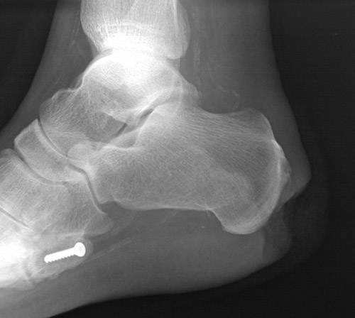 | This patient with diabetes mellitus developed an ulceration of the foot which was non-healing and became secondarily infected. The inflammation extended through the soft tissue and broke through the bone cortex into the underlying calcaneus, resulting in osteomyelitis marked by the area of lucency seen here. |