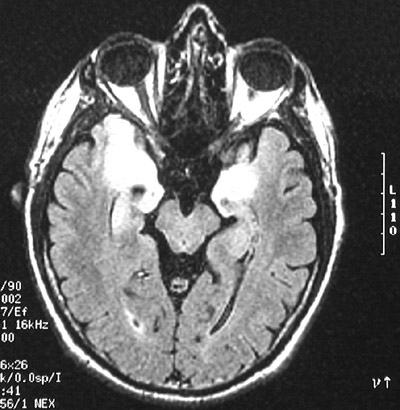 | This axial view of a FLAIR MRI scan reveals limbic encephalitis involving temporal lobes bilaterally. This inflammatory process is most likely to involve medial temporal lobe, amygdala, hypothalamus, and hippocampus. The marked brightness of the lesions is seen early in the course of this disease. |