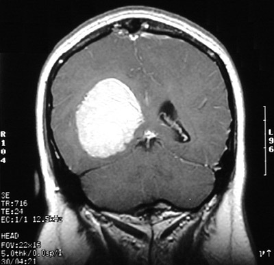 | The T1 weighted MRI scan in axial view above demonstrates another less common location for a meningioma, an intraventricular meningioma. In this location, a circumscribed mass could also be an ependymoma. Below can be seen the same right lateral ventricular mass with contrast enhancement in T2 weighted axial view and T1 weighted coronal view. |