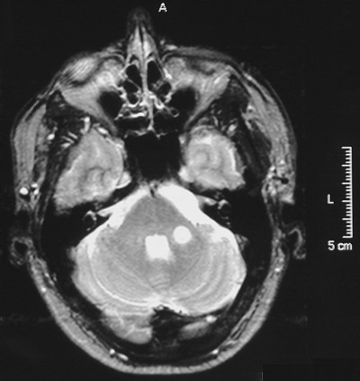 In the T2 weighted scans of the cerebrum above and the cerebellum below both demonstrate enhancing