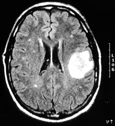 | These MRI scans in axial view, T2 weighted above and FLAIR below, demonstrate an enhancing solitary mass with minimal adjacent edema. This is a solitary metastasis from a pulmonary adenocarcinoma. In adults, metastases are more common than primary brain tumors. Typical primary sites include lung, breast, and kidney. |
