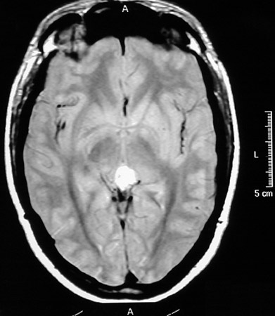 in the region of the pineal gland. This is a pineocytoma. Below this mass appears bright in axial view post gadolinium injection.