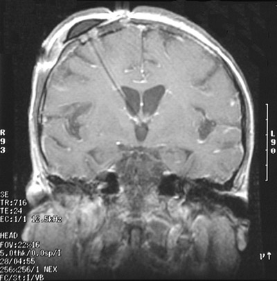 | In the coronal view above and the sagittal view below with these T1 weighted MRI scans can be seen an Ommaya reservoir placed under the scalp with catheter extending into the ventricle in a patient with a carcinoma metastatic to the meninges. Such a reservoir provides a means for delivering chemotherapeutic agents in high concentration. |