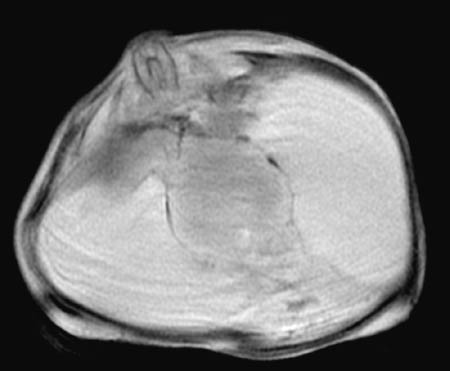 This T1 weighted MRI scan in axial view demonstrates a case of alobar holoprosencephaly with a